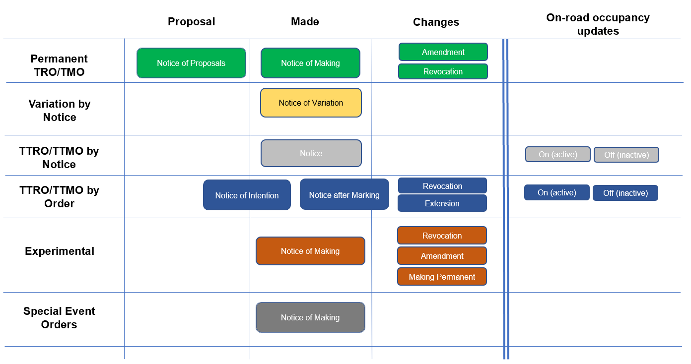 The scope of the Data Model covers all different forms of Order (permanent, temporary, experimental, special events and notices) for both moving and stationary traffic.